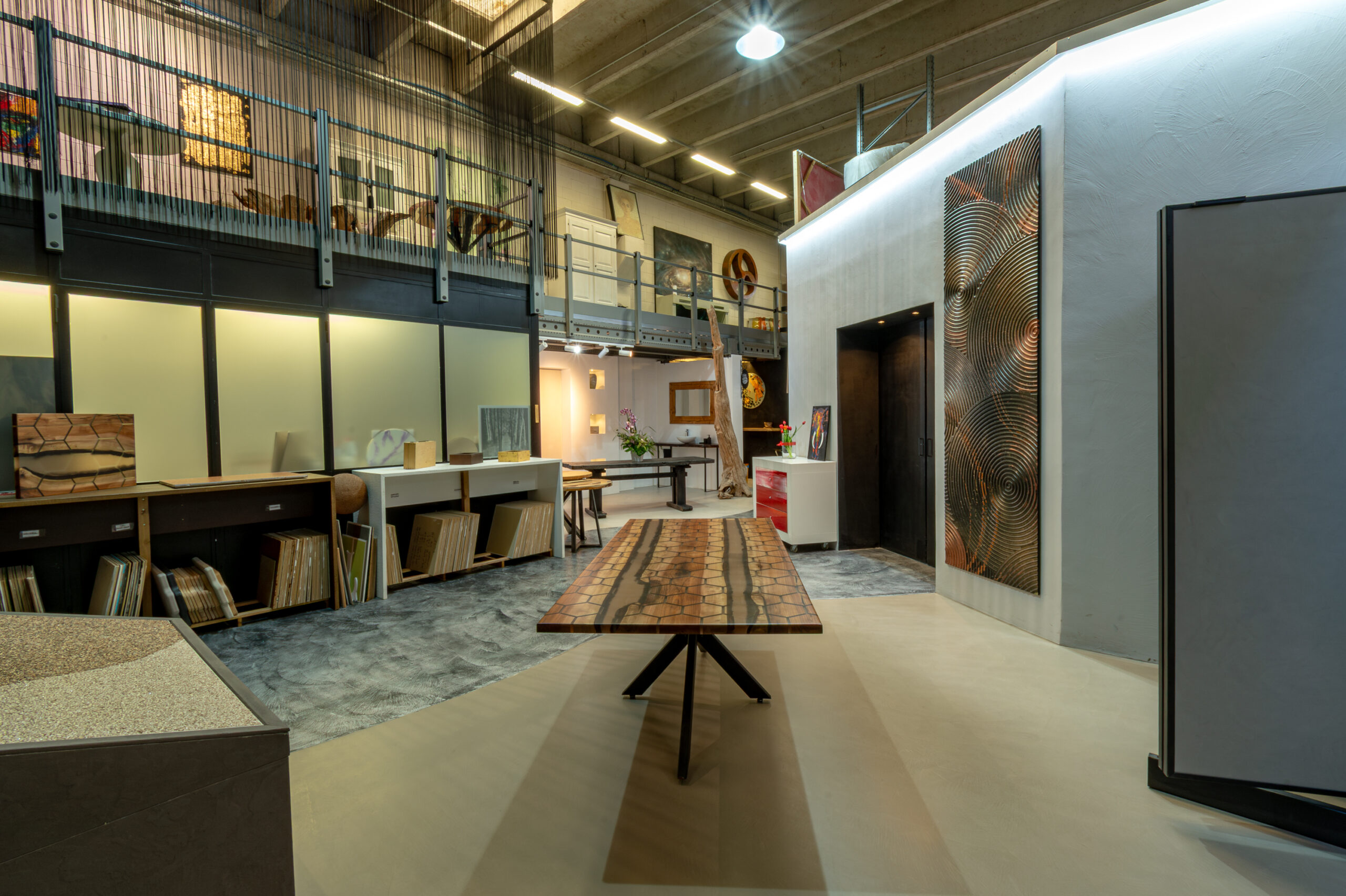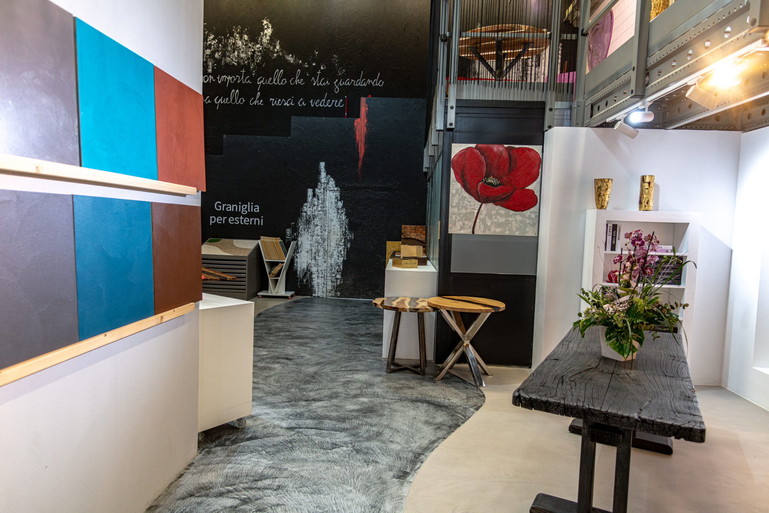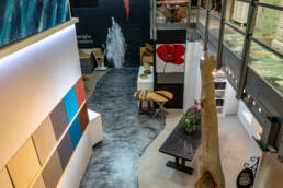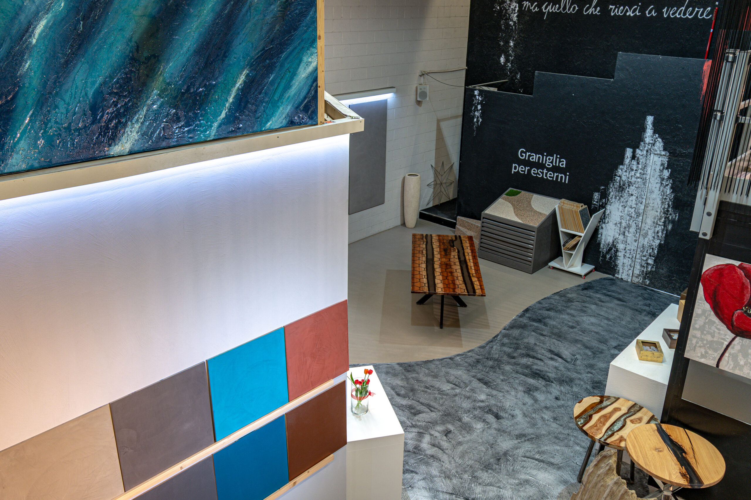 Il nostro showroom di 400 mq è uno spazio pensato per ispirare e guidare nella scelta dei materiali. Qui puoi vedere e toccare con mano rivestimenti in resina per interni ed esterni, superfici continue, finiture su misura e complementi d’arredo in resina realizzati artigianalmente. Un’ampia zona campionaria ti permette di esplorare combinazioni, texture e colori, mentre un’area accogliente è dedicata al confronto diretto: un luogo dove privati, architetti e professionisti possono discutere idee e progetti in un clima di ascolto e collaborazione. La visita allo showroom è su appuntamento, per garantirti un’esperienza esclusiva e completamente personalizzata.